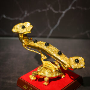 Tượng Cụ Rùa cõng Gậy Như Ý mạ vàng 24K là sự kết tinh giữa biểu tượng linh thiêng và nghệ thuật chế tác tinh xảo. Rùa là một trong Tứ Linh trong văn hóa Á Đông, đại diện cho trí tuệ – sự trường thọ – bền vững, còn Gậy Như Ý mang ý nghĩa thuận buồm xuôi gió, cầu được ước thấy.
