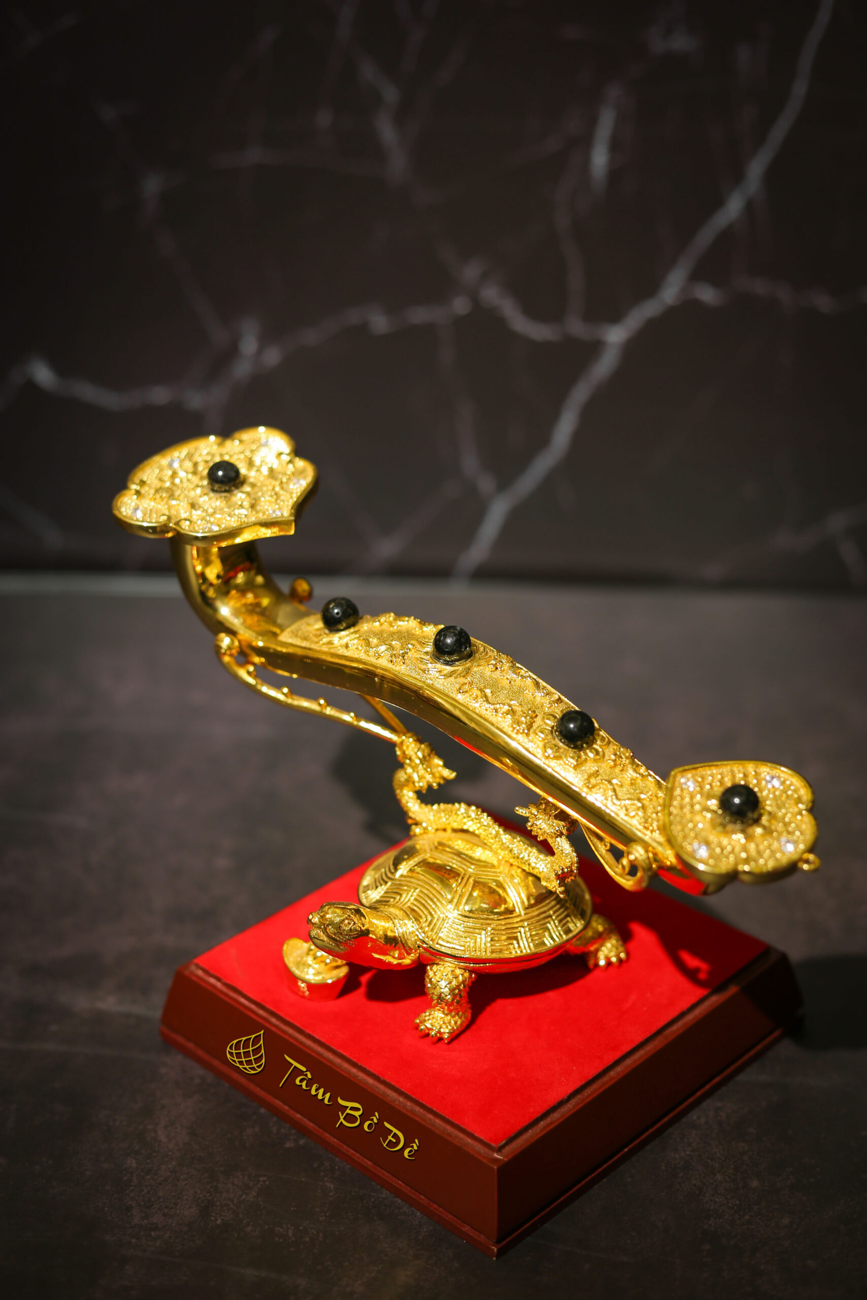 Sự kết hợp hài hòa giữa hình ảnh cụ Rùa và Gậy Như Ý tạo nên vật phẩm phong thủy độc đáo, không chỉ mang vẻ đẹp trang trọng nhờ lớp mạ vàng 24K óng ánh, mà còn chứa đựng thông điệp cát tường, thu hút vượng khí, tài lộc và sự hanh thông trong công việc – cuộc sống.